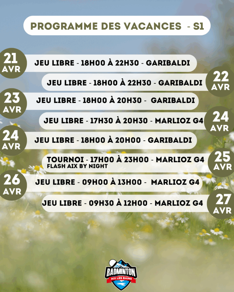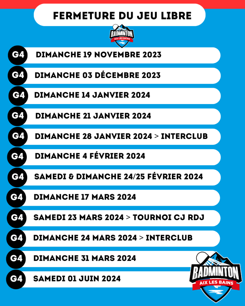 14 décembre à 9h00 - 17h00 à Gymnase Marlioz G4Rencontre interclub – Créneau jeu libre fermé à 20h (équipe 6)