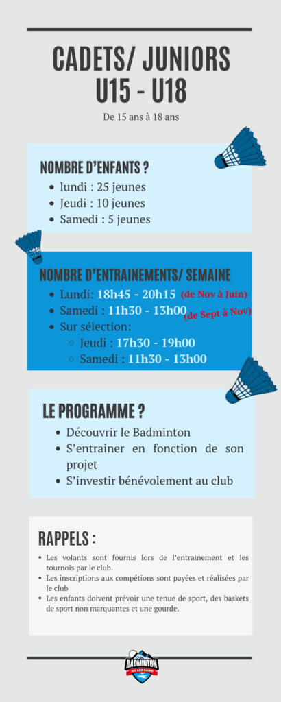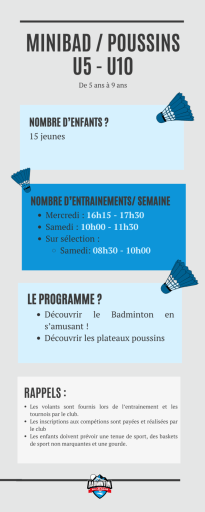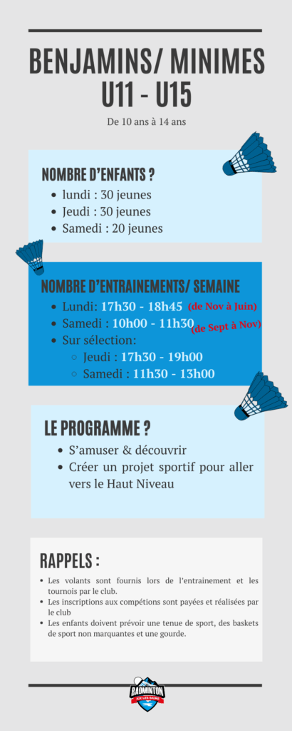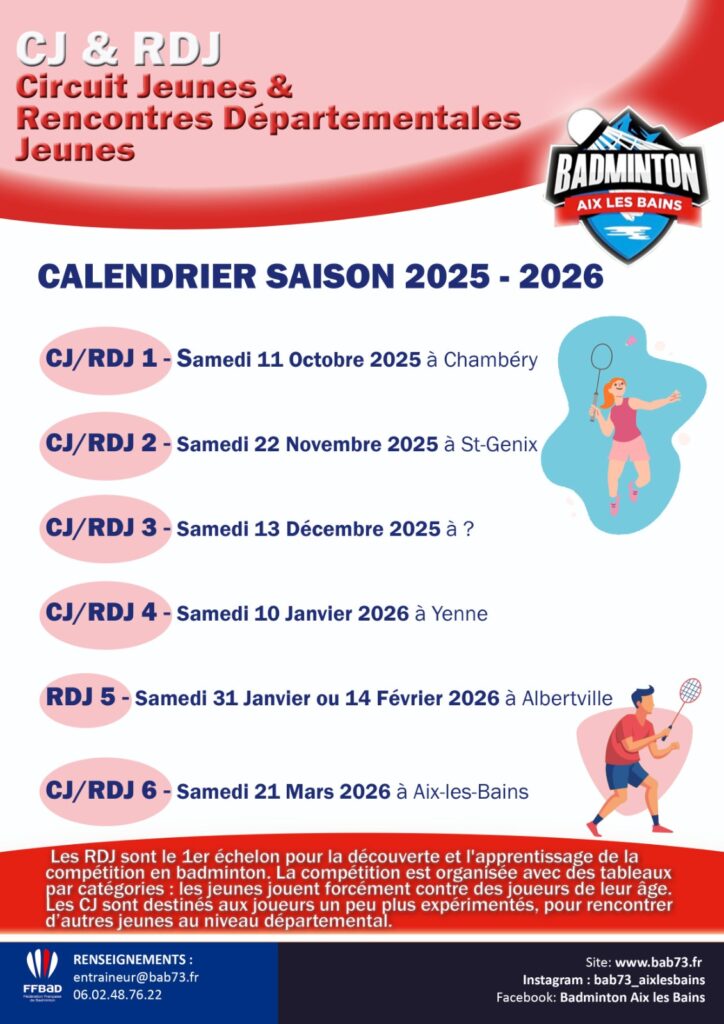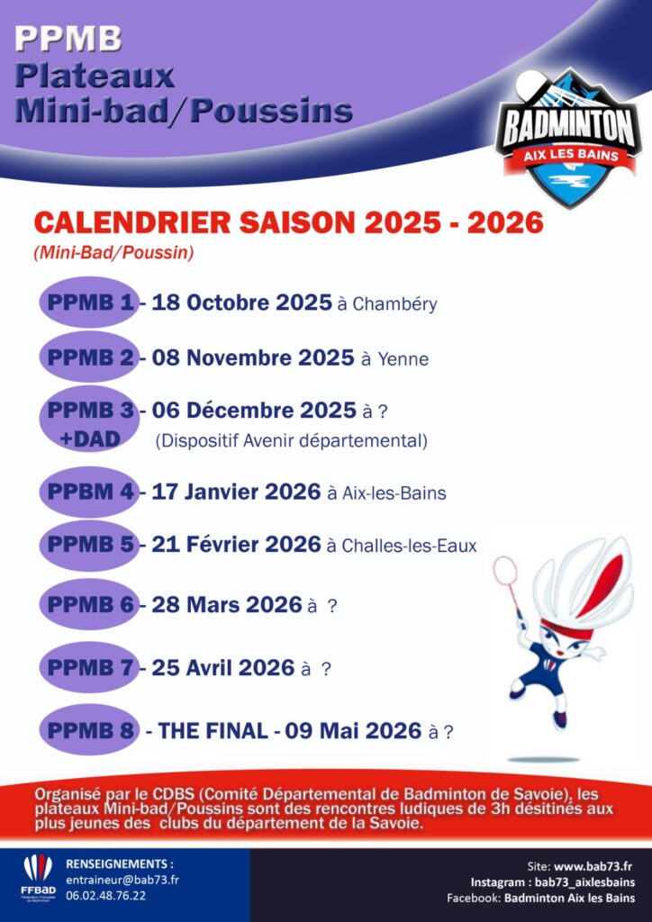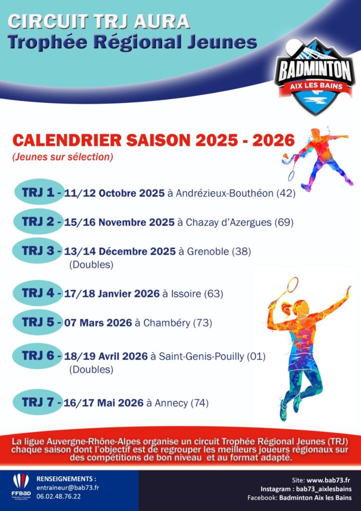 L’école du Badminton Aix-les-Bains est labellisée 3 étoiles sur 5, avec plus de 50 jeunes allant régulièrement en compétition (plus de 100 enfants dans le club). Depuis la création du Challenge Inter-Ecole Jeunes il y a 4 ans par le Comité, le BAB reste invaincu avec 4 titres successifs obtenus avec brio dans les différentes catégories du challenge (poussins, benjamins, minimes, cadets et junior). Les jeunes ont la possibilité, selon leur projet, leur motivation et la sélection du coach, de pouvoir s’entrainer 1 à 2 fois par semaine, voire une 3ème fois en plus sur proposition du coach. Des sessions de préparation physique sont incluses pour les plus motivés. L’école de jeunes se compose de joueurs évoluant du niveau départemental au niveau régional dont certains et certaines dans le top 20 de la ligue Auvergne Rhône Alpes.